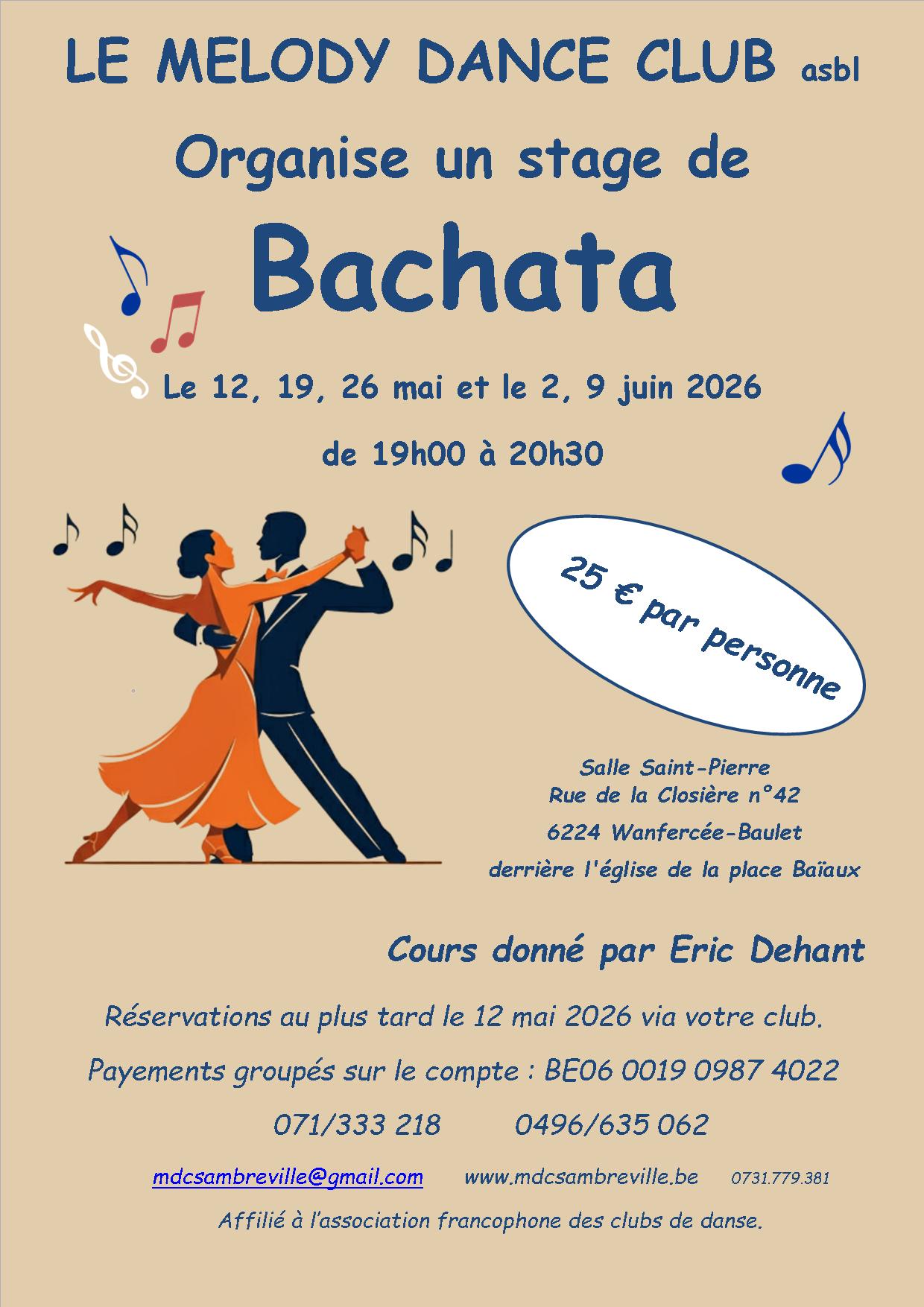 - Stage de mai le 12, 19, 26 mai et le 2 et 9 juin 2026 nous ferons de la Bachata.